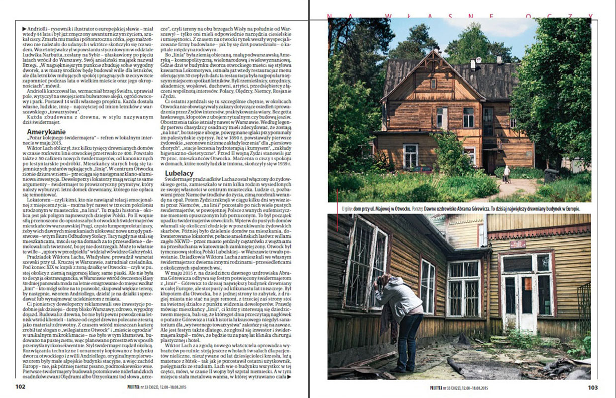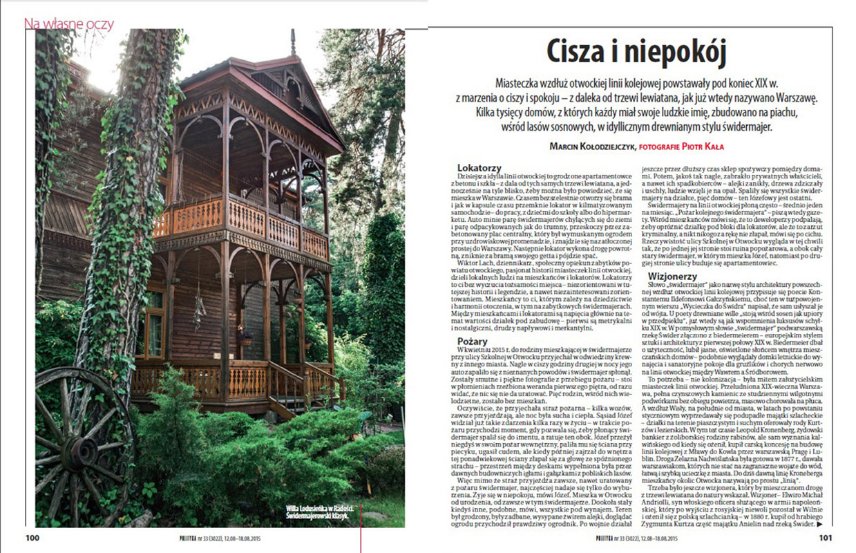 Pod koniec XIX wieku wzdłuż linii kolejowej prowadzącej z Warszawy do Otwocka powstał jeden z najciekawszych stylów architektonicznych w Polsce. Kilka tysięcy domów dla letników ze stolicy, z których każdy miał swoje imię ludzkie, zbudowano na piachu, wśród lasów sosnowych, w idyllicznym drewnianym stylu świdermajer. Po ponad 100 latach nie wiele zostało z ich dawnej świetności. Większość domów uległa spaleniu, część stanowi mieszkania komunalne; tylko nieliczne z nich, po gruntownym remoncie, świecą dawnym blaskiem…